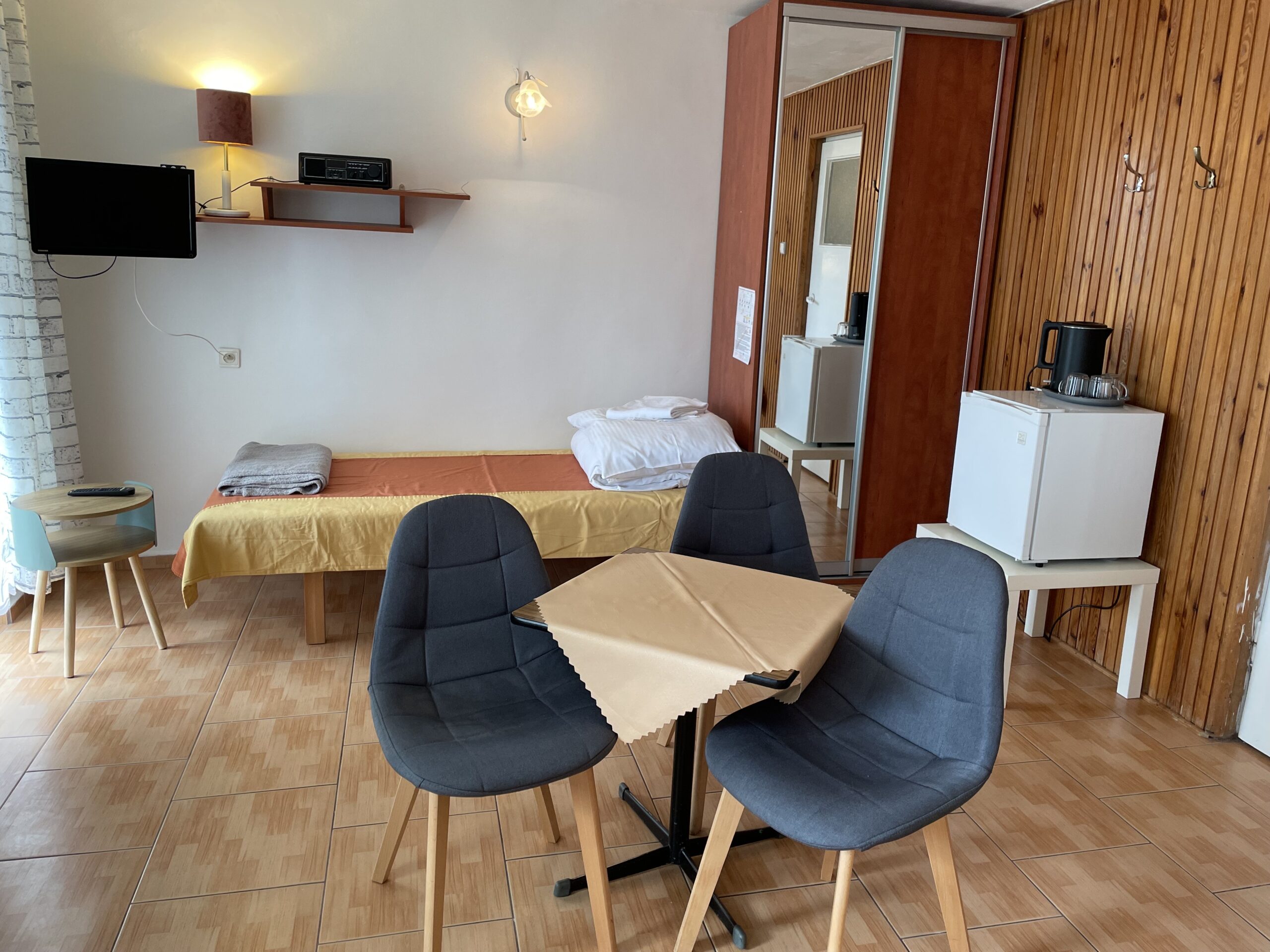 - Każdy pokój wyposażony jest w łazienkę z prysznicem, telewizję satelitarną, radio, telefon, czajnik bezprzewodowy oraz sprzęt plażowy.
