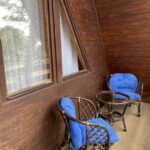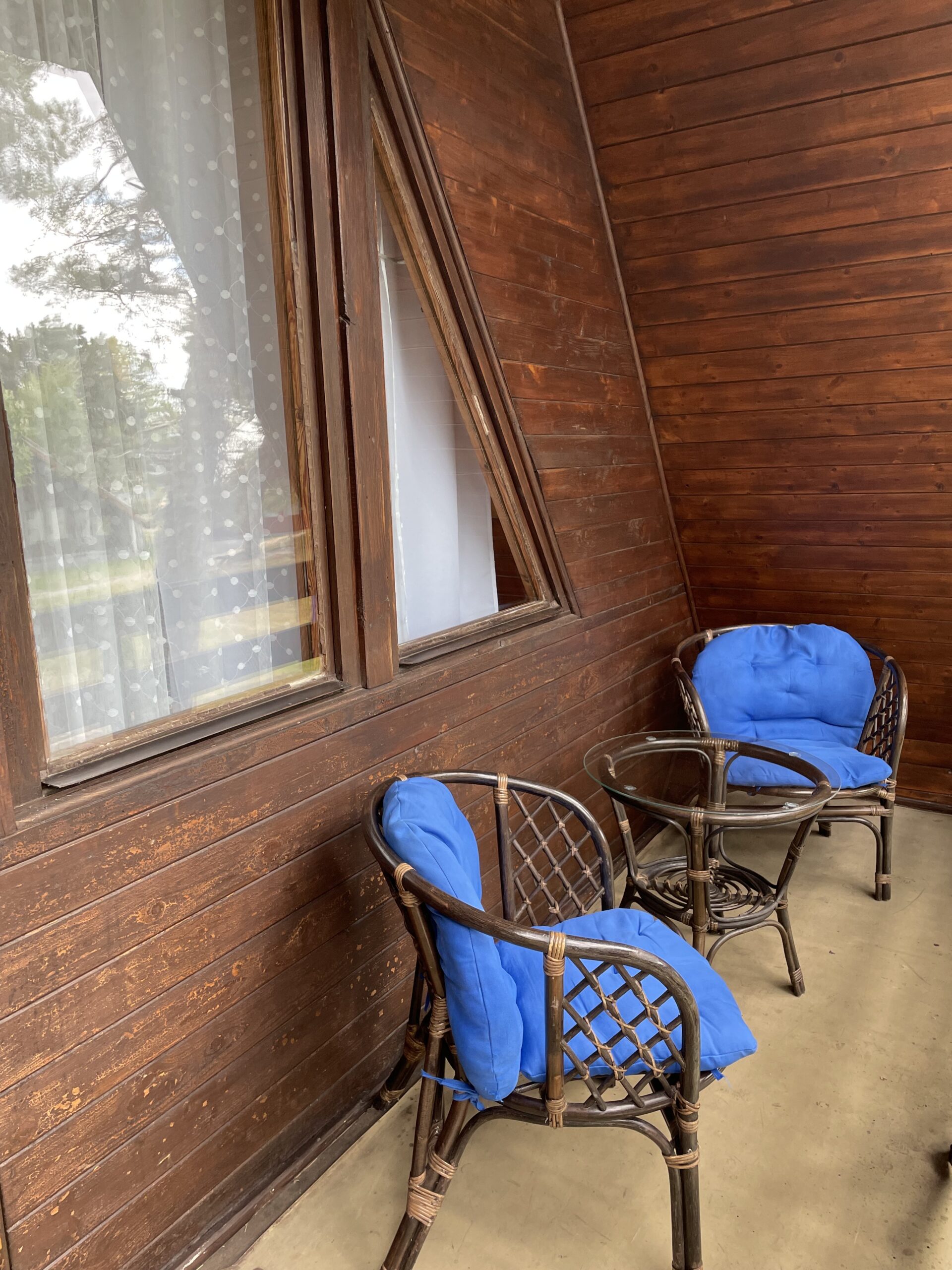 - Pawilon z pokojami otoczony tarasami wkoło budynku.